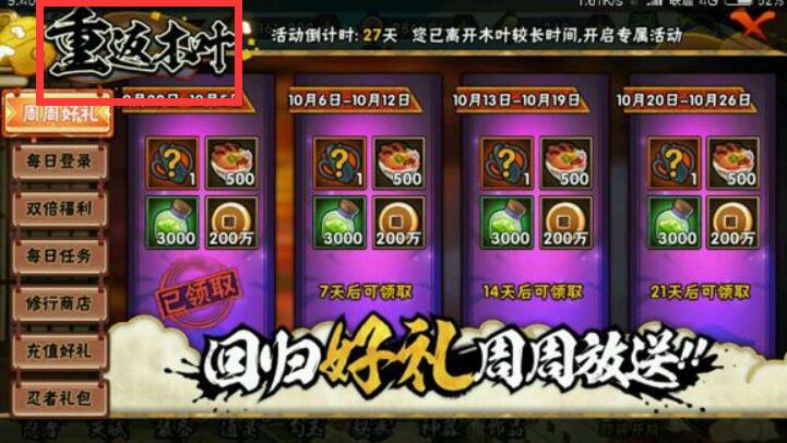 火影忍者重返木叶活动分为两种七天和一个月活动,玩家七天没有上线未到1个月,就会触发七天的重返木叶活动。玩家一个月以上时间没有上线时,会开启重返木叶的一个月活动。