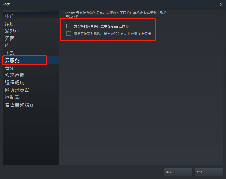 2、点击steam客户端左上角steam,点击设置,选择云服务,云储存同样取消勾选。