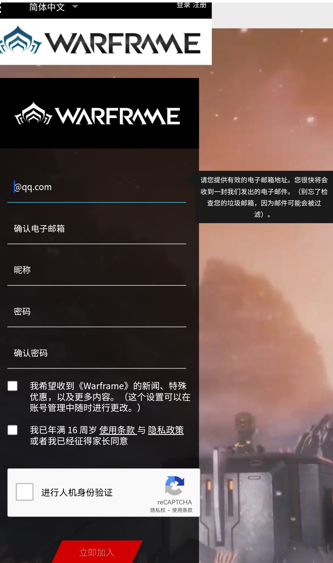 星际战甲用什么邮箱注册? 1、首先进入星际战甲的官网,然后点击左上角的注册。如果是英文的可以切换到简中字体2、进去之后只要使用有效的电子邮箱地址都可以注册,因为要接受验证码的。例如QQ邮箱、谷歌邮箱等都是可以的。
