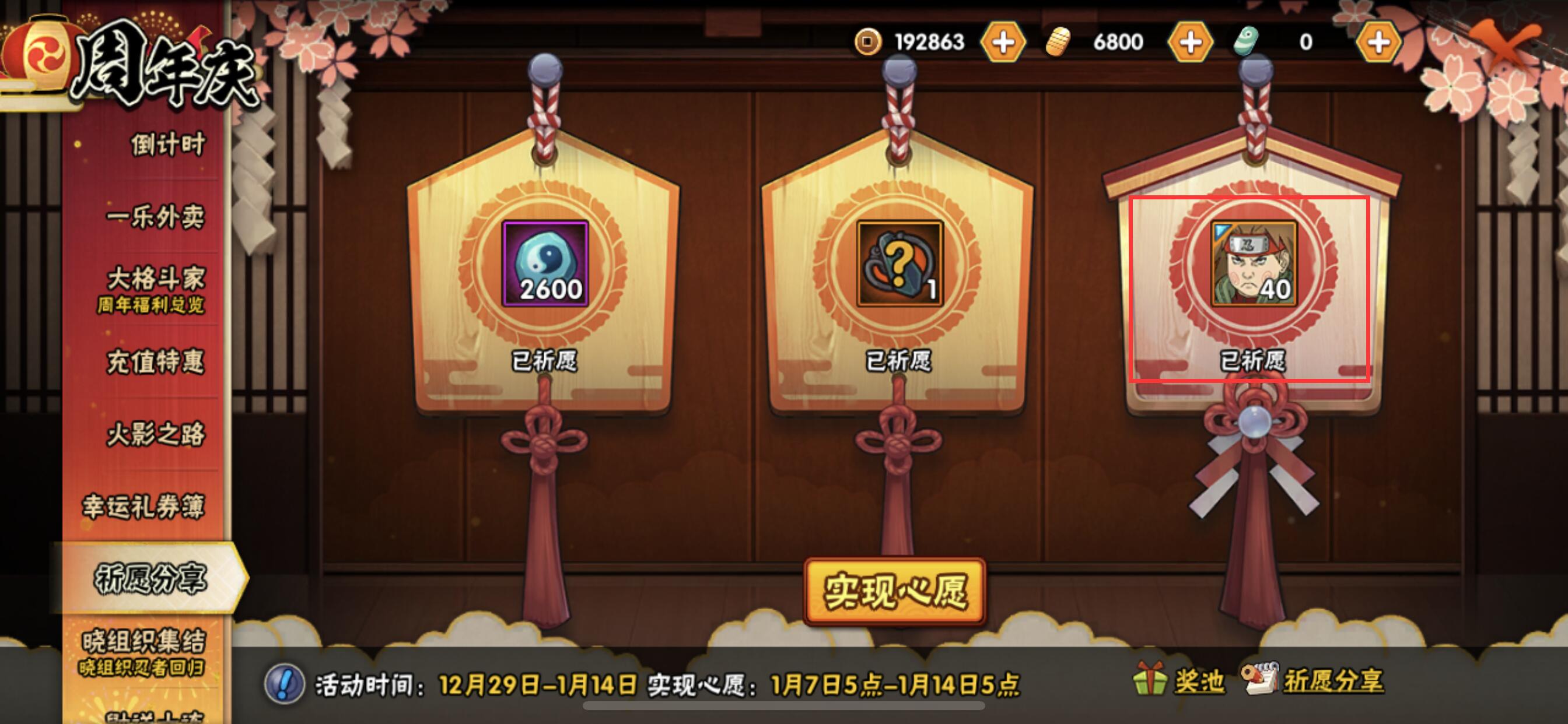 1、在游戏的祈愿分享活动中,累积登录祈愿分享5天就可以自行选择两个A忍、三个B忍自选包、5个忍者之印这几种奖励。