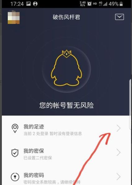 2,安装完成后打开QQ安全中心APP,按照图示箭头选择左上角人头选项按钮。