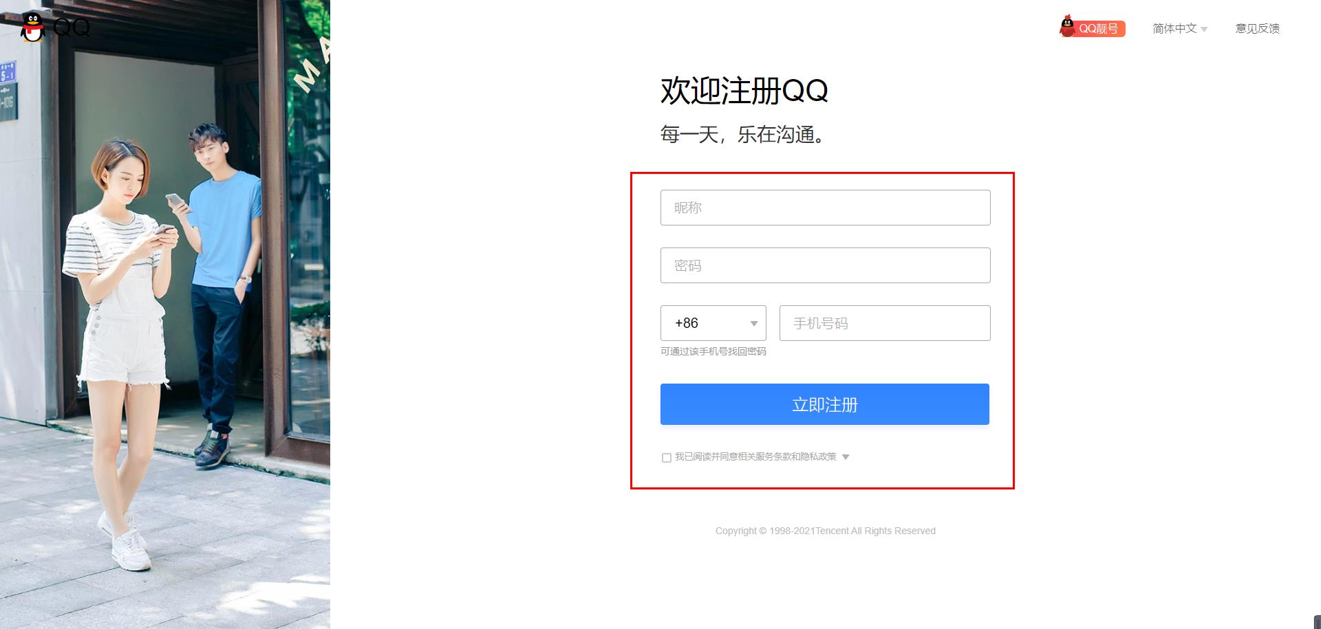 2. 然后分别填入昵称、密码、手机号码点击立即注册