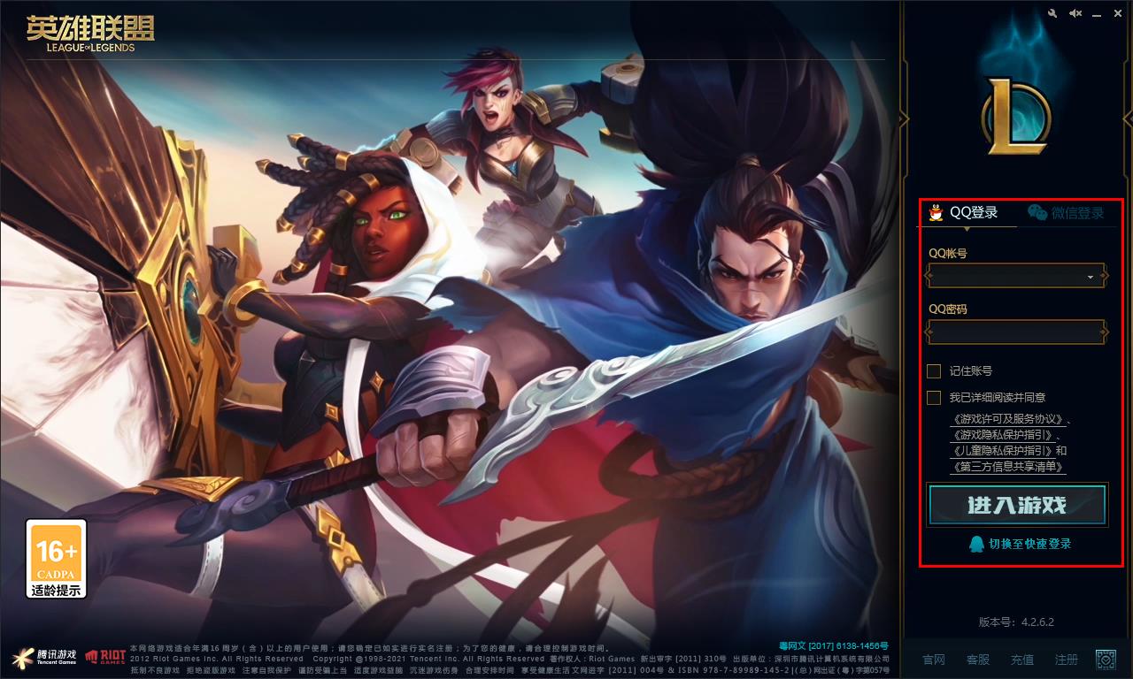3. 注册完成后打开英雄联盟客户端选择QQ登录输入QQ号码与密码即可登录